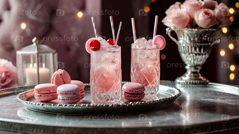 Элегантные мягкие розовые коктейли с льдом и морозом в винтажных бокалах на серебряном подносе с вишней и макаронами
