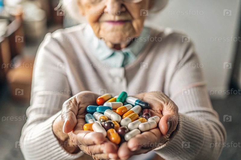 Здоровье и медицина.Пожилая пенсионерка держит в руках красочные витамины, таблетки, капсулы и таблетки.Концепция здоровья и повседневной жизни пожилых людей