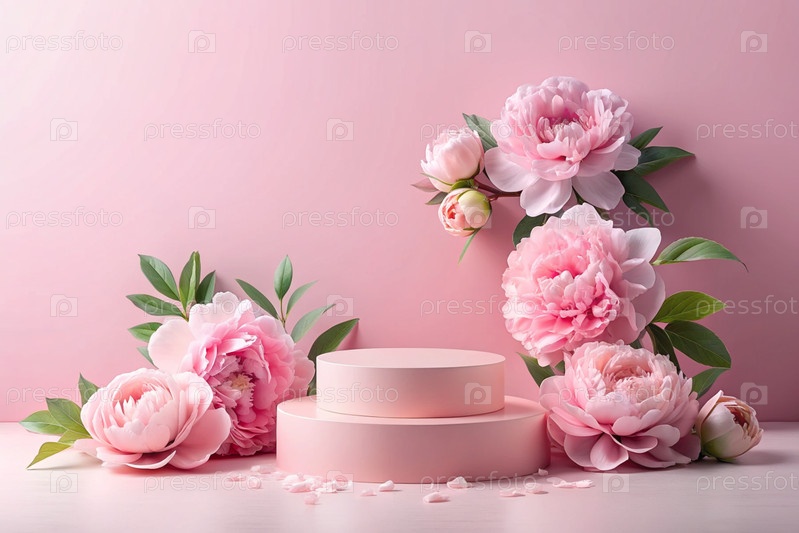 Минималистский розовый пастельный фон для демонстрации продукта.Современный подиум с розовой стеной и розовыми пионками вокруг.Креативный дизайн презентации продукции