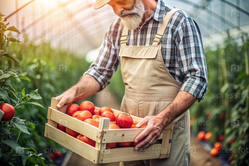 Сельскохозяйственная промышленность. деревянный ящик с помидорами в руках фермера-мужчины. садовник собирает богатый урожай в теплице