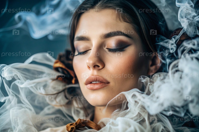 Молодая красивая женщина, завернутая в дым. 'Датура', закрывающая лицо прекрасной девушки