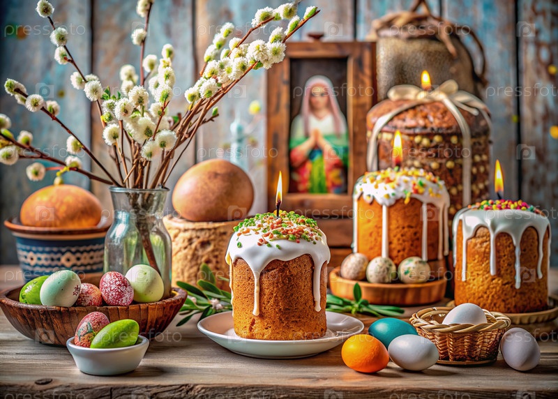 Православный Пасхальный торт, окрашенные яйца, иконы, лица святых, цветы, церковные свечи и пасхальное украшение на деревянном столе в старом деревенском доме