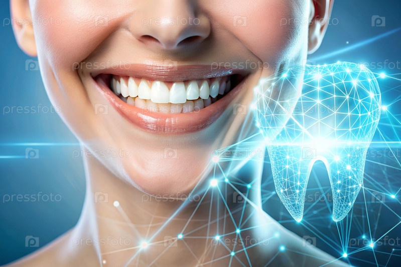 Новые технологии в протезировании зубов. Имплантаты. Улыбающаяся женщина со здоровой, идеальной улыбкой. Концепция стоматологического здоровья и ухода за зубами