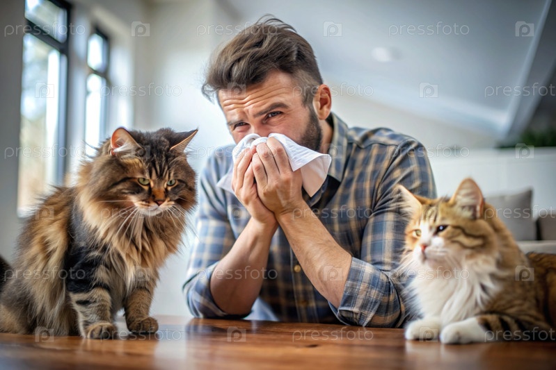 Мужчина чихает в белое полотенце дома. Аллергия на волосы кошек и домашних животных. Рядом со мной кот