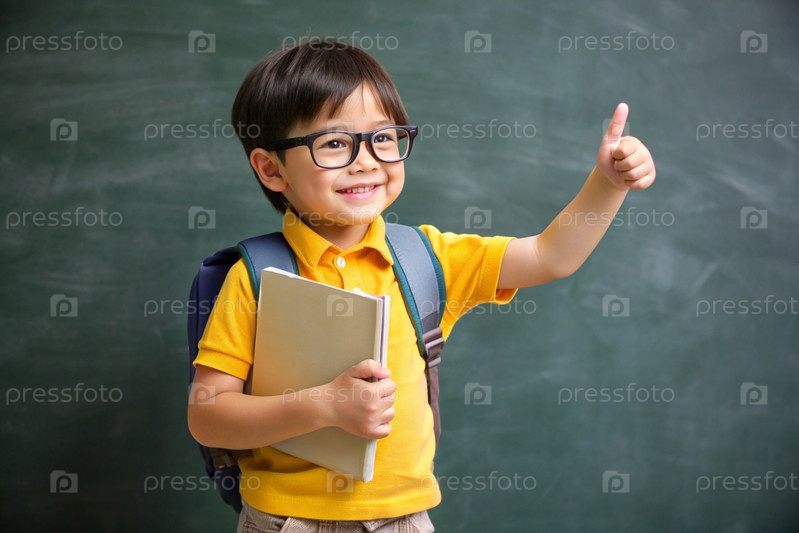 Мальчик с очками показывает класс своей рукой. Ребенок впервые идет в школу. Ребёнок со школьной сумкой и книгой. Ребёнок в классе с доской на заднем плане. Возвращение к школе