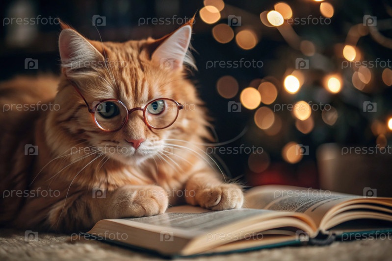 Красивая, большая рыжая кошка с модными круглыми очками для чтения лежит на деревянном столе со своей книгой