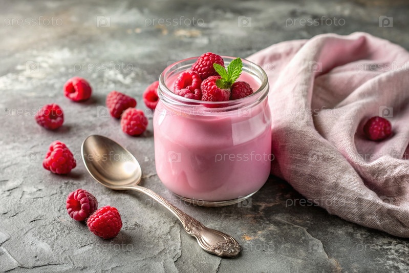 Домашний малиновый йогурт со свежими малинами, винтажной ложкой и полотенцем на стильном сером фоне