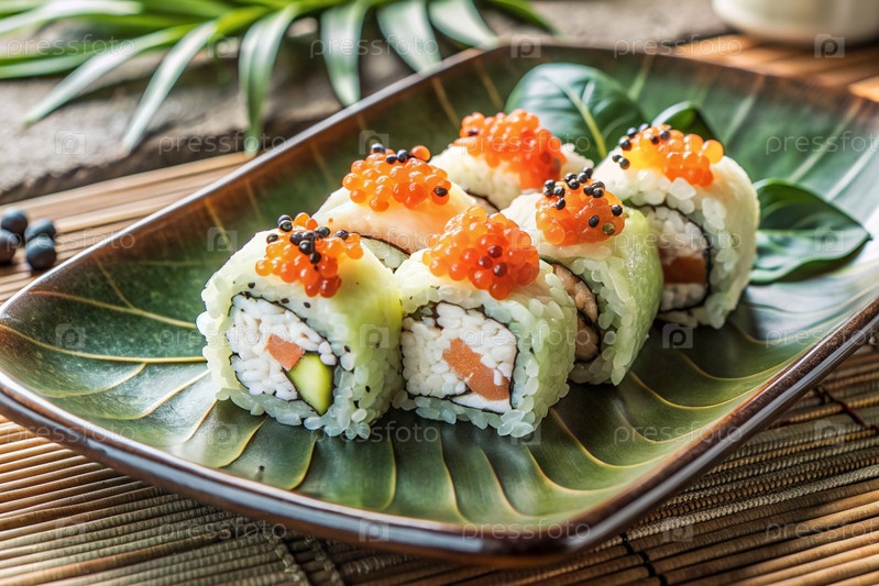 Японская еда. Суши-роллы Калифорния, Филадельфия с угорьем, красной икры и лососем. Концепция меню суши-бара