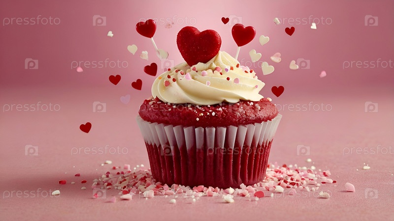 Проветриваемый красный бархатный кексы с сливочным сыром и сердцами, окруженными сахарной ленточкой на тёплом розовом фоне ко Дню святого Валентина и 8 марта