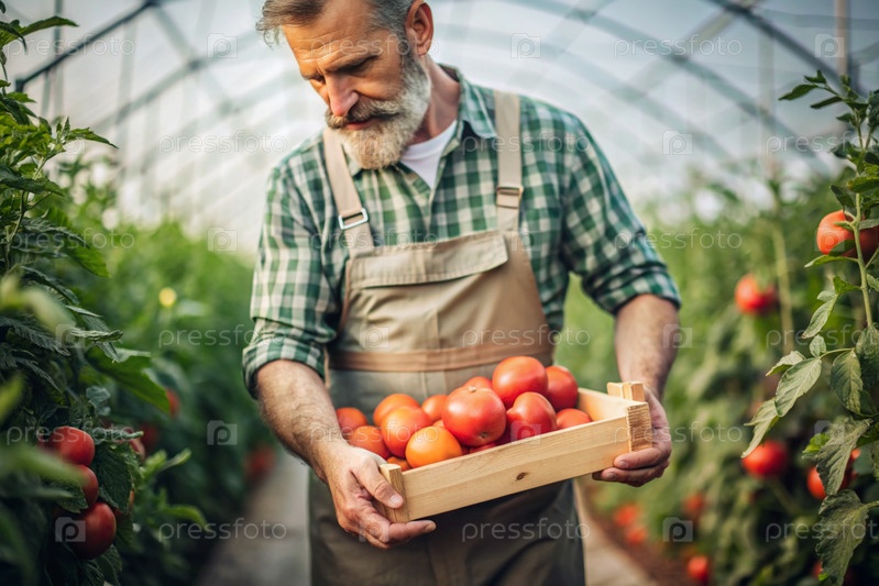Сельскохозяйственная промышленность. деревянный ящик с помидорами в руках фермера-мужчины. садовник собирает богатый урожай в теплице