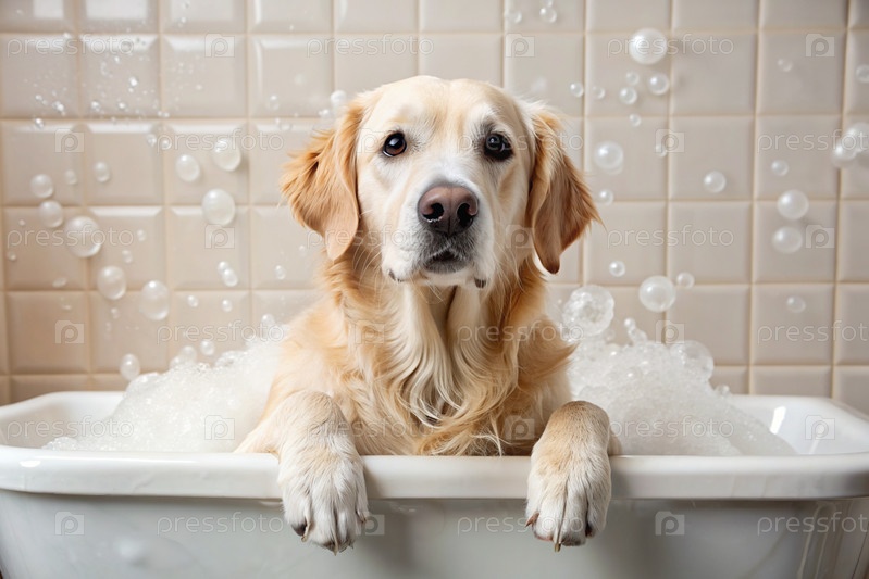 Золотой ретривер купается в пузырьковой ванне. Помыть собаку. Концепция ухода за домашними животными