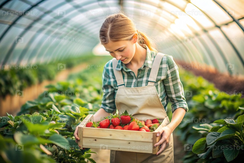 Сельскохозяйственная промышленность. деревянный ящик со клубниками в руках фермерской девушки. садовник собирает богатый урожай в теплице