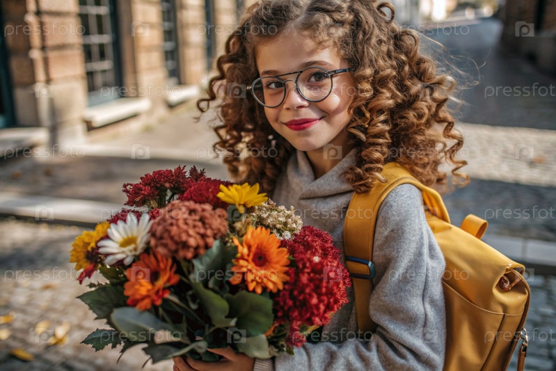 Красивая маленькая кудрявая девочка в очках и букете осенних цветов ходит в школу впервые. Ребенок со школьной сумкой, книгой и цветами. Малыш на городской улице. Возвращение к школе