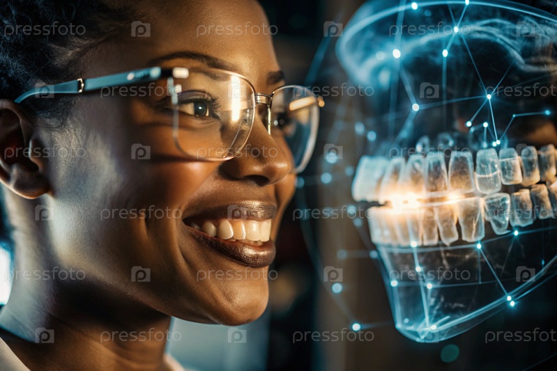 Новые технологии цифрового искусственного интеллекта в зубных протезах. Имплантаты. Чернокожая женщина-стоматолог с идеальной улыбкой и цифровой стоматологической графикой на виртуальном экране. Концепция здоровья зубов и ухода за зубами