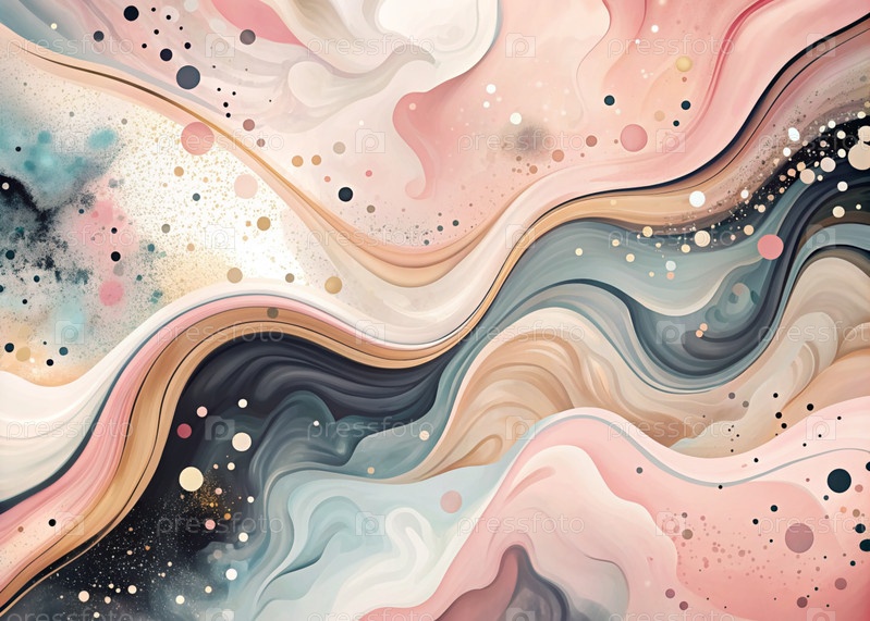 Абстрактный, мечтательный акварельный фон с волнами, полосами, жидкими потоками розового, синего и черного цвета и жемчужинами