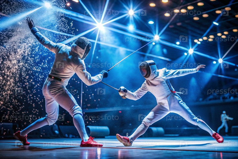 Фехтовальщики на арене с рапирами в руках во время тренировок дерутся в дуэли. Спортивное фехтование. Фехтование является типом летних Олимпийских игр
