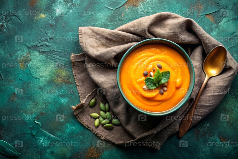 Традиционный мягкий тыквенный кремовый суп с сливками и семьями тыквы на бирюзовом бетонном фоне