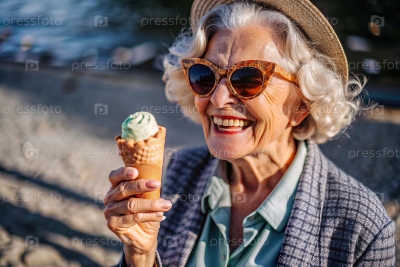 Портрет необычной, стильной, модной пожилой женщины, пенсионерки 70 лет с мороженым в руках во время отпуска на пляже у моря