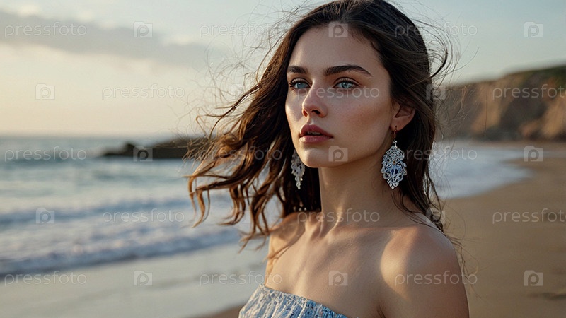 Портрет красивой женщины на пляже перед морем.Романтическая, спокойная и чувственная фотография девушки в проветренном нежном платье
