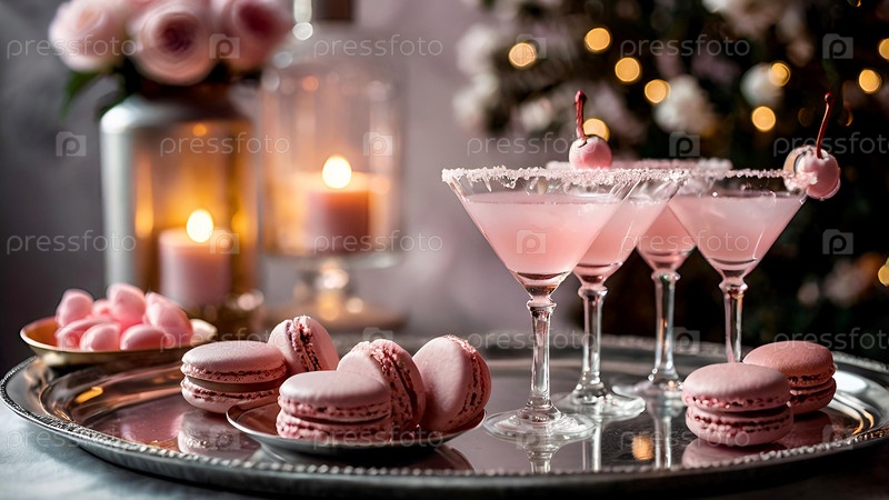 Элегантные мягкие розовые коктейли с льдом и морозом в винтажных бокалах на серебряном подносе с вишней и макаронами