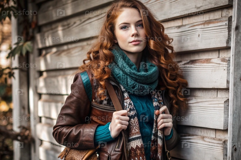 Осенний портрет. Близкий план молодой рыжеволосой женщины с выразительными зелеными глазами в коричневом кожаном куртке и бирюзовом шарфе