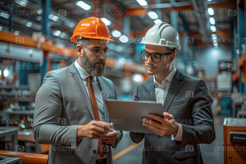 Профессиональный инженер, рабочий и техник в жестких шляпах используют клипборд для обсуждения работы на сталелитейном заводе