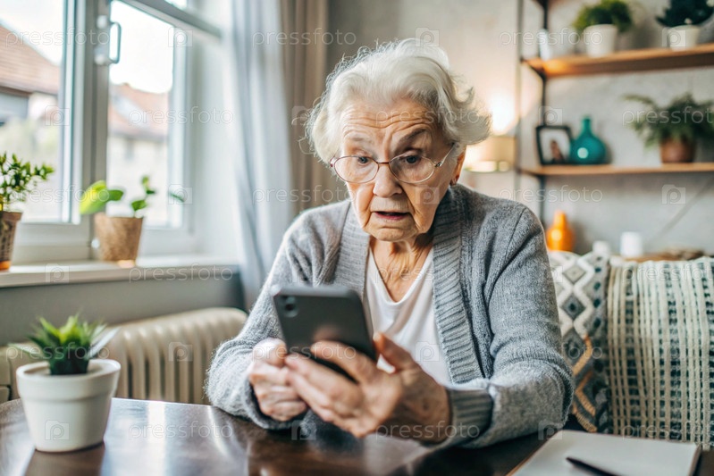 В шоке, обеспокоенная пожилая женщина смотрит на свой смартфон с неприятным удивлением, испытывая стресс, финансовые проблемы, кражу денег