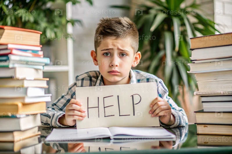 Учебный год.Ребенок сидит за столом с кучей учебников, книг и знака помощи.Образование, помощь