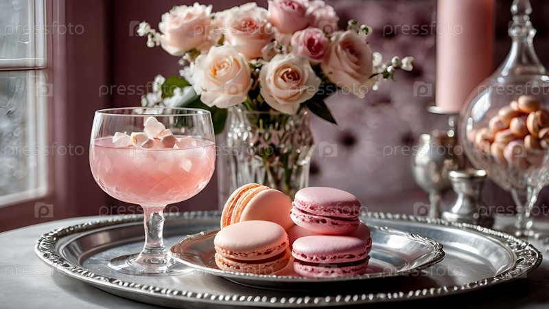 Элегантные мягкие розовые коктейли с льдом и морозом в винтажных бокалах на серебряном подносе с вишней и макаронами