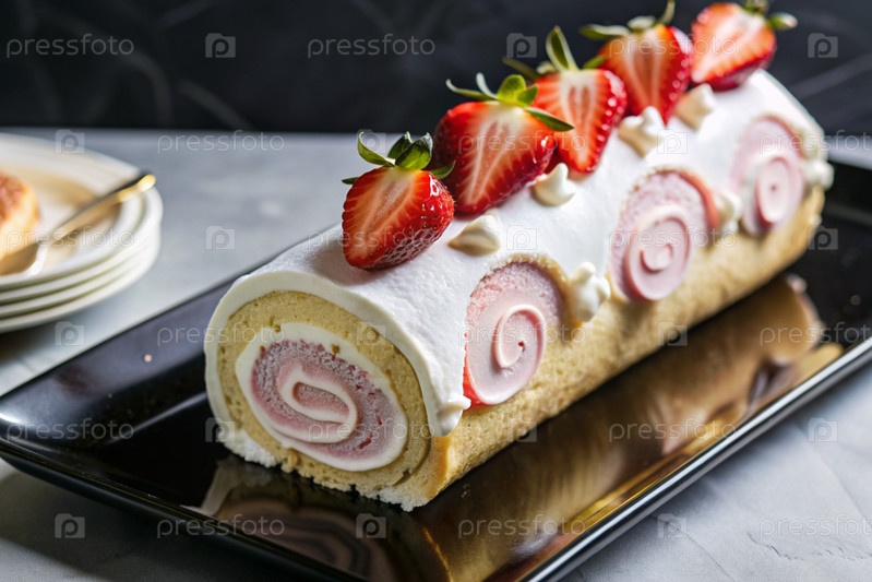 Швейцарская губка со клубникой, вкусный фруктовый и кремообразный десерт наполненный сливочным сыром, украшенный свежими ягодами