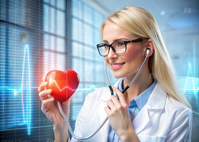 Медициной молодой красивой девушки является кардиолог с очками в кабинете со стетоскопом.Красные цифровые коды в виде частоты сердечных сокращений на виртуальном экране.Цифровые технологии будущего