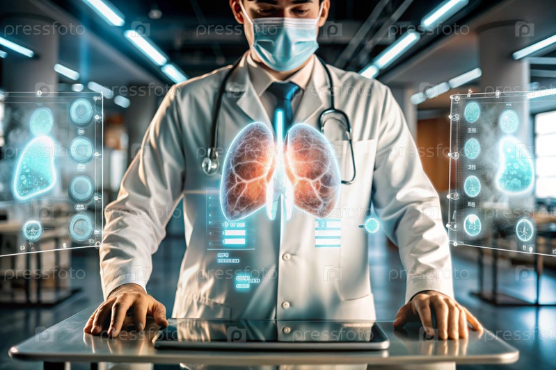 Врач в белом пальто демонстрирует голографическую модель человеческого легкого.Развитие медицинских технологий с использованием искусственного интеллекта