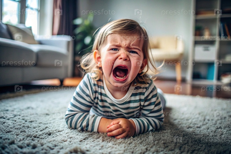 Маленькая девочка лежит на полу. Детская истерия. Ребенок кричит, плачет, становится капризным и истеричным. Недовольство
