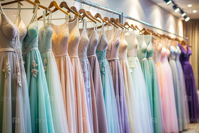 Элегантные женские платья висят с белых вешалок на штанге в салоне