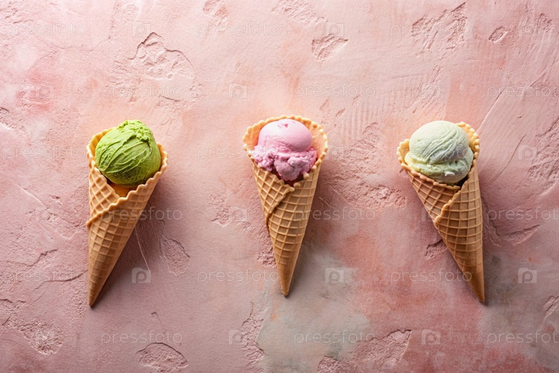 сладкий десерт. морозильные шишки с различными вкусами на бетонном розовом фоне. Всемирный день мороженого