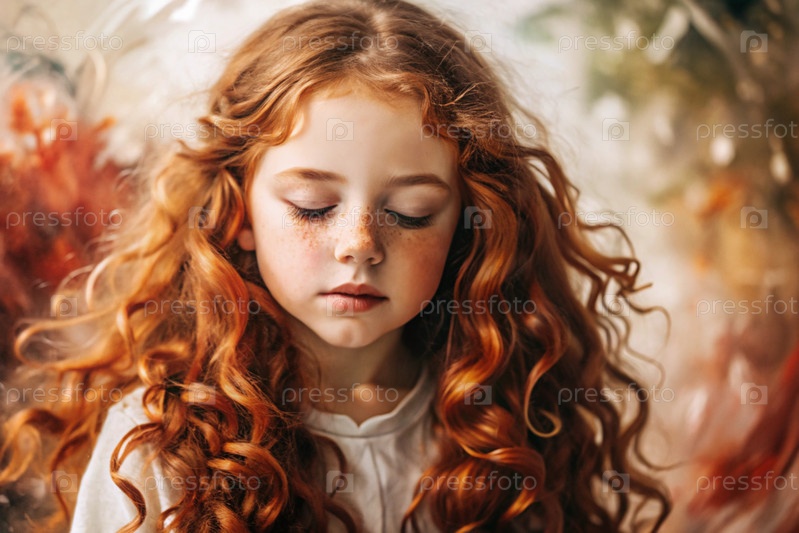 Портрет красивой маленькой рыжеволосой девочки с длинными волнистыми волосами и задумчивым взглядом.Власы развиваются и создают ощущение легкости и естественности