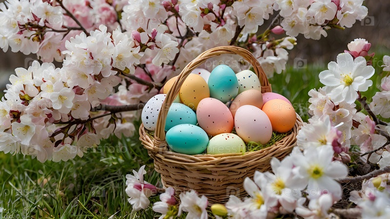 Красивый фон с пасхальными яйцами в плетеновой корзине и весенними вишневыми цветами