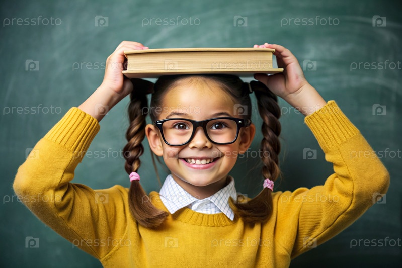 Красивая девушка с очками и книгами на голове. Ребенок впервые идет в школу. Ребёнок в классе со доской на заднем плане. Возвращение к школе