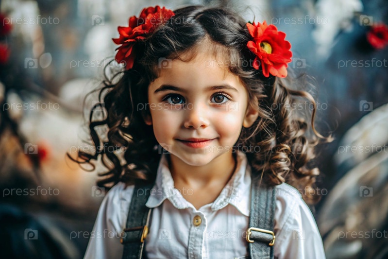 Портрет красивой маленькой кудрявой темнокожей девушки с цветочной тиарой или венком красных цветов на голове
