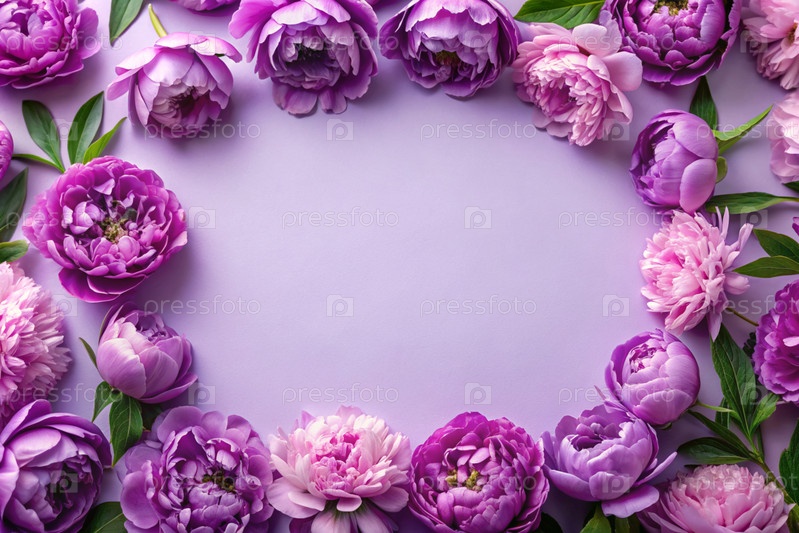 Рама с красивыми цветками пиони на пастельно-фиолетовом фоне