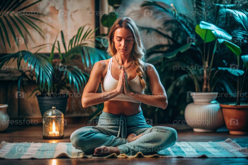 Концепция эзотерической духовной медитации, женщина в позе лотоса.Человеческая медитация, духовность и активация чакр, мистический дух