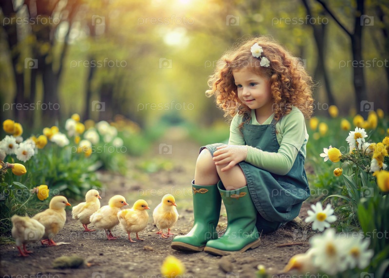 Маленькая кудрявая девочка в резиновых сапогах в цветущем весеннем саду с желтыми цыплятами
