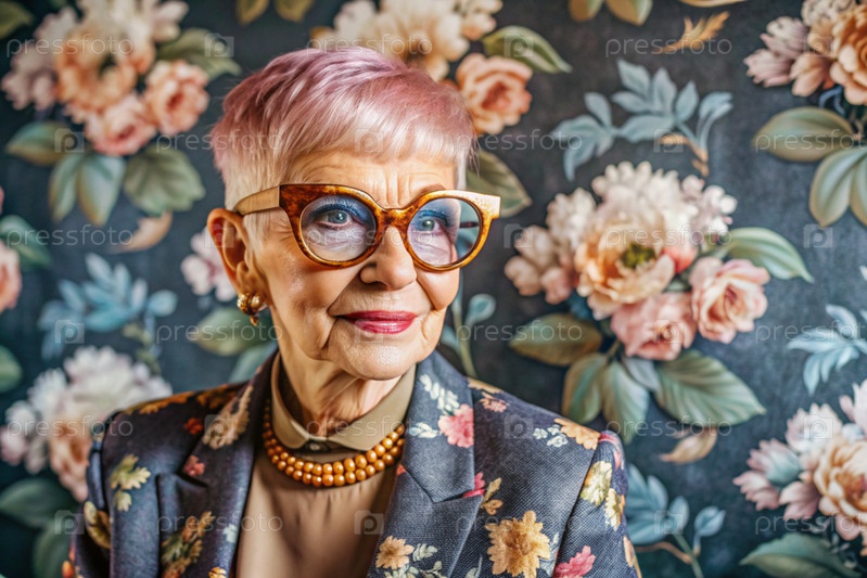 Портрет стильной, модной пожилой женщины, пенсионерки 70 лет, которая носит очки и одежду с цветочными оттисками