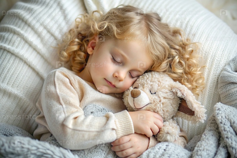 Маленькая блондинка с кудрявыми длинными светлыми волосами спит в своей постели, обнимая плюшевого кролика