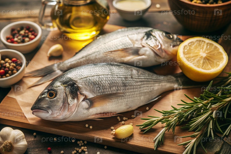 Вкусная и здоровая рыба. сырой дорадо с лимоном и ингредиентами на темном фоне. баннер, меню, место для текста рецепта, верхний вид
