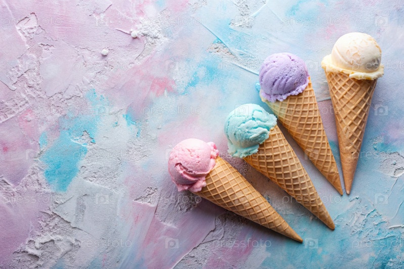 сладкий десерт. морозильные шишки разных вкусов. синий, розовый и фиолетовый мороженое на фоне трех пастельных цветов: синего, розового и фиолетового