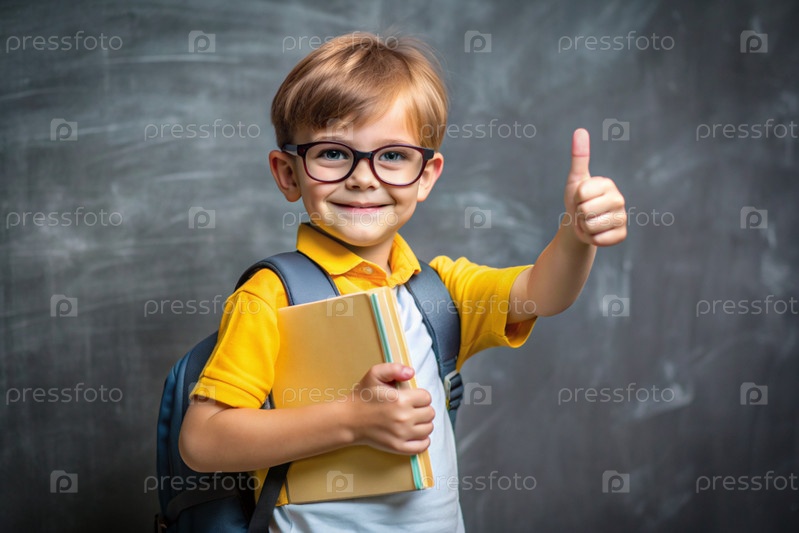 Мальчик с очками показывает класс своей рукой. Ребенок впервые идет в школу. Ребёнок со школьной сумкой и книгой. Ребёнок в классе с доской на заднем плане. Возвращение к школе