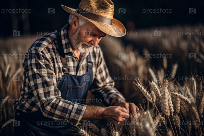 Фермер-мужчина держит золотые колосья пшеницы на фоне созревающего поля. Близкий план фермера. Концепция посадки и сбора богатого урожая. Сельский пейзаж при закате солнца