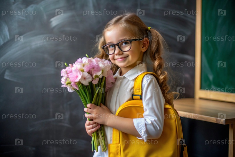 Милая, красивая первоклассница с очками. Букет цветов. Ребенок впервые идет в школу. Ребёнок с рюкзаком, книгой и цветами. Возвращение к школе