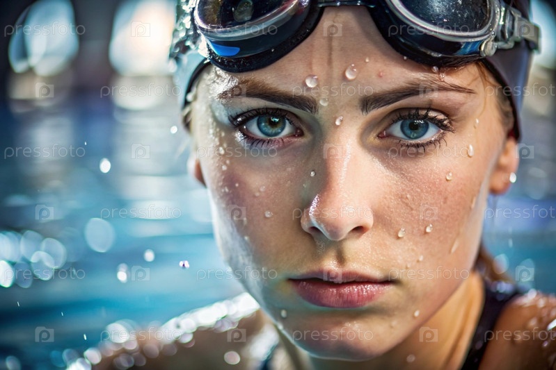 Спортивное плавание. Женское плавание. Спортсменка, которая носит очки для плавания в бассейне во время соревнований на близком расстоянии. Женщина смотрит прямо в камеру
